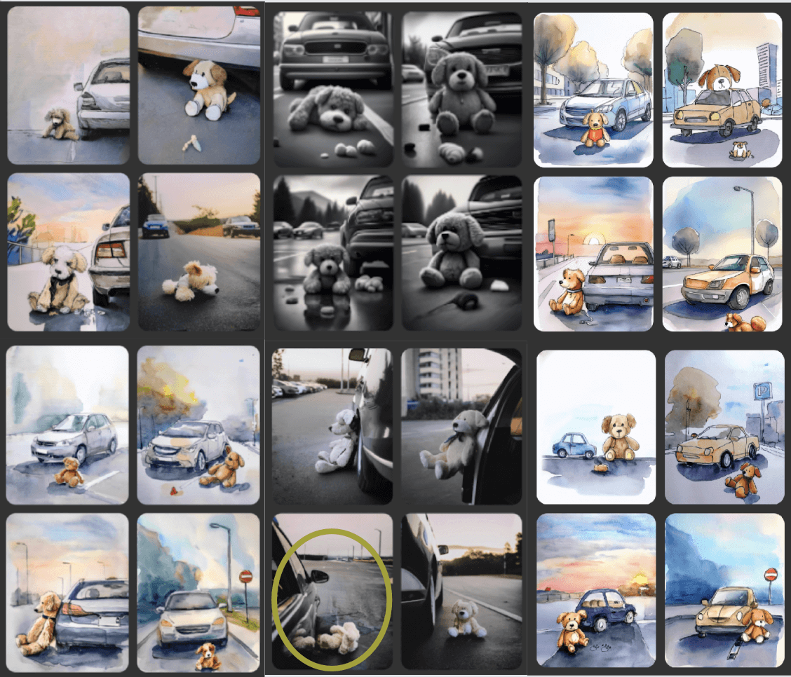 RESULTS Realistic styles feel more impactful due to the moody colors. After viewing the generated images, I realized I no longer clearly remember the plush toy's face. Interestingly, the one where it appears the most ragged feels closest to my fragmented memory. However, the outcome differed slightly from my recollection, as it wasn’t indoors as I remembered. Yet, upon enlargement, it’s hard to tell that it’s an outdoor car park. Despite many prompts, accurately recreating the memory through this method proved challenging.