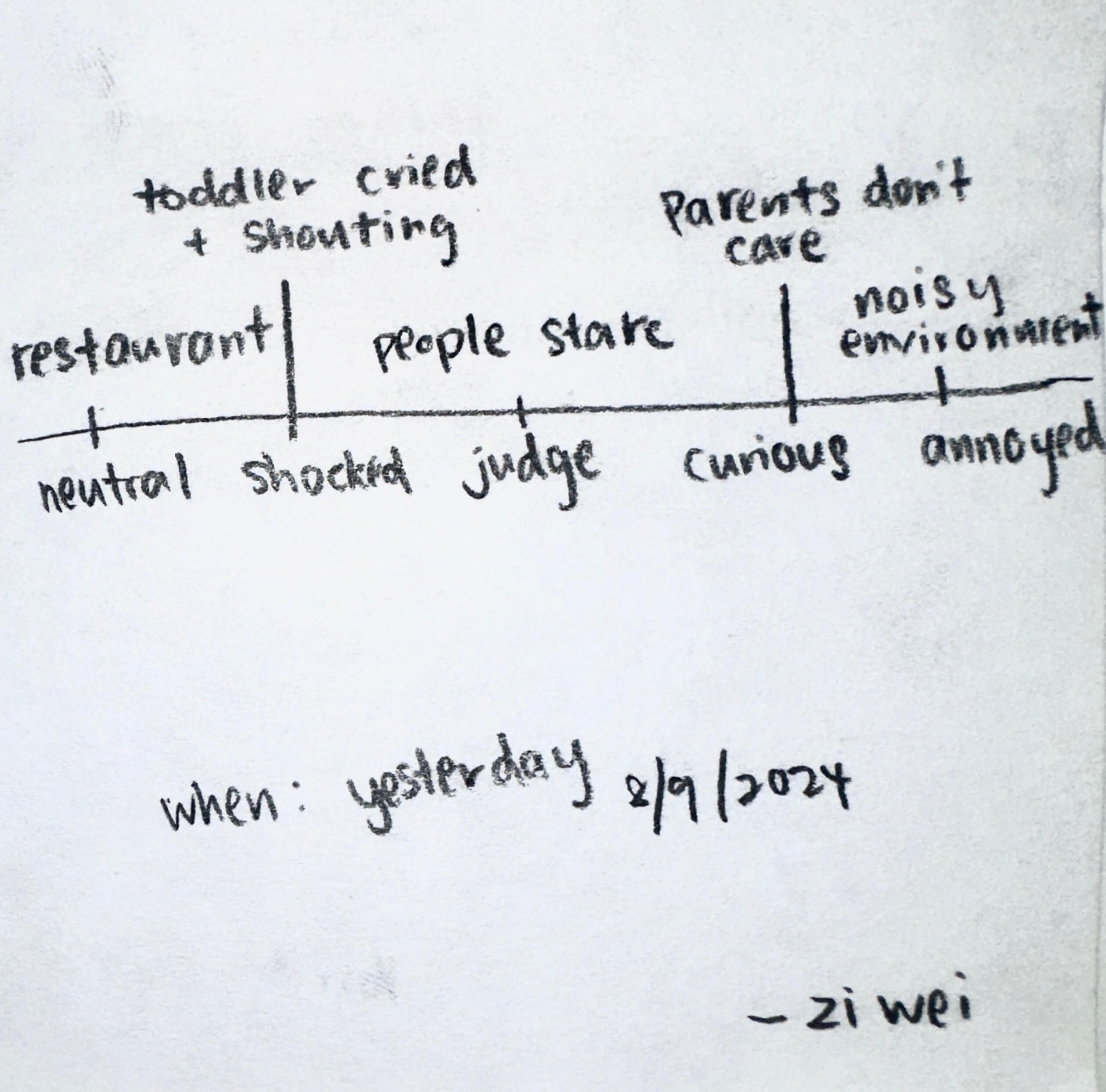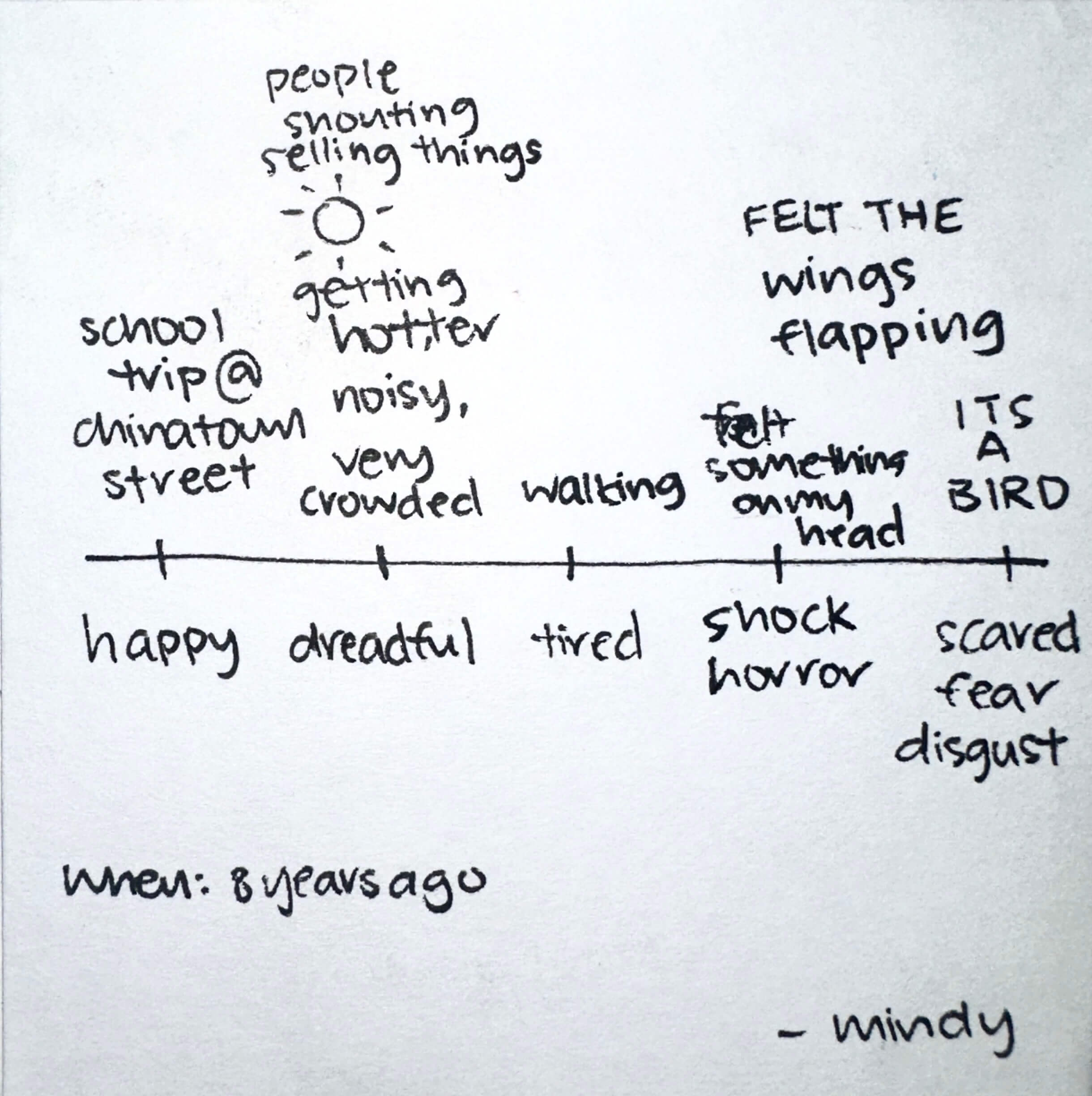 OBJECTIVEUse a timeline to translate a memory into hand-drawn visuals, illustrating key moments and details. Next, recall the sounds within the memory and represent them as a drawn soundwave, incorporating color-emotion associations to connect the visuals, sounds, and feelings.